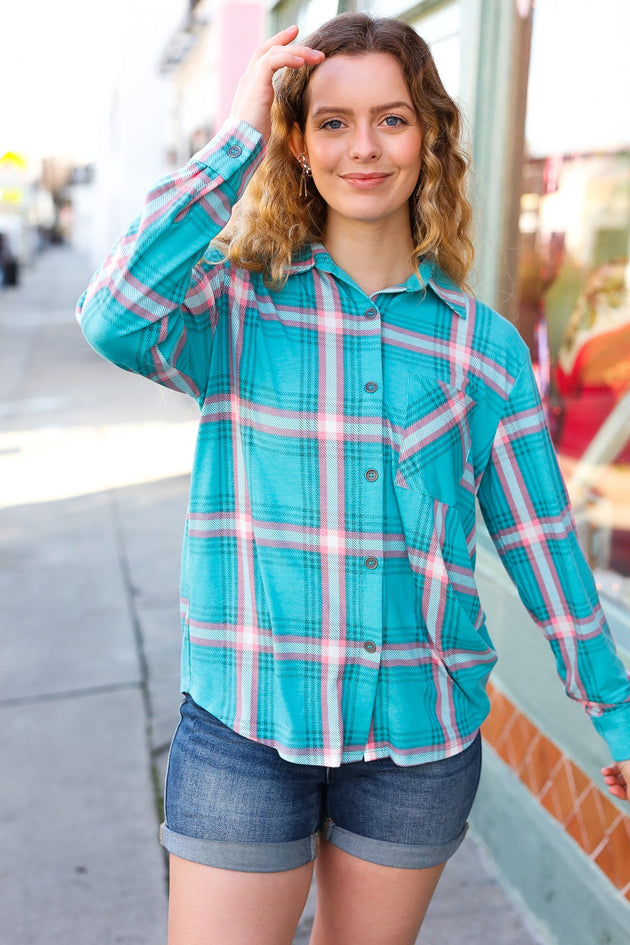 Teal & Pink Plaid Front Pocket Button Down Shacket