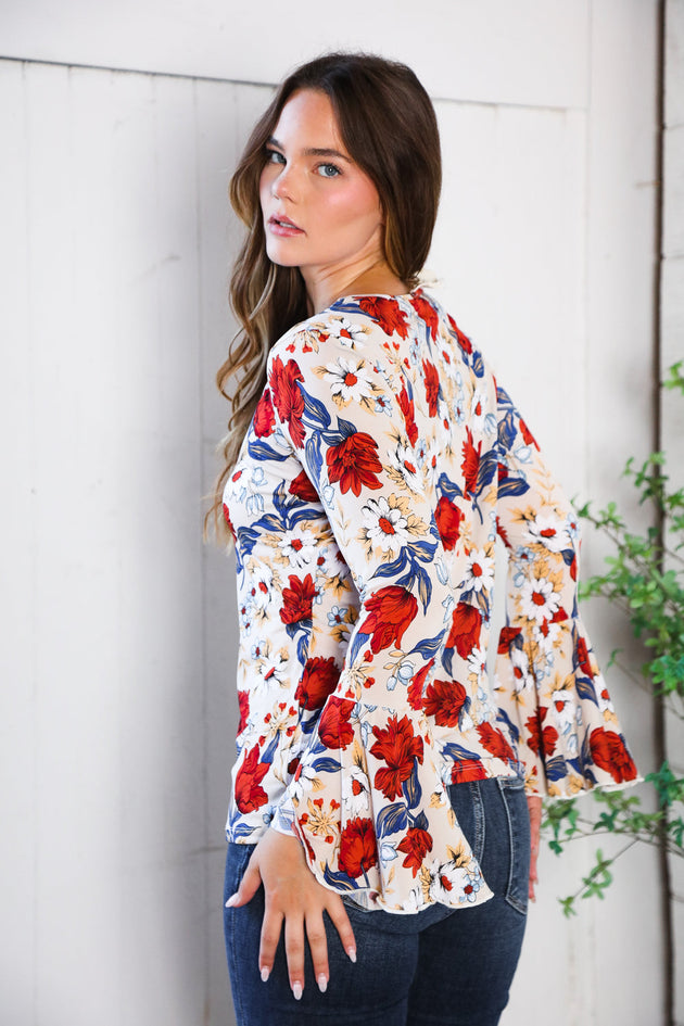 Sunset Floral Print Ruffle Tiered Keyhole Top