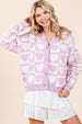 The Checkered Heart Button Down Cardigan is a stylish and charming sweater featuring a checkered pattern and heart-shaped buttons. This cozy cardigan is a versatile addition to your wardrobe, perfect for adding a touch of whimsy to your outfit while keeping you warm and comfortable.