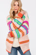 This open front knit cardigan features a stylish rainbow-colored stripe design. Drop shoulders and ribbed sleeve cuffs offer a relaxed and comfortable fit. The long sleeves and oversized silhouette provide a cozy and on-trend look. This cardigan is perfect for layering over your outfits and adds a fun pop of color and personality to your style. The open front design makes it easy to wear, while the ribbed cuffs add a touch of texture to the overall look. Overall, this rainbow striped open front knit cardigan is a fashionable and statement-making piece for adding a playful vibe to your wardrobe.