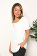 This solid blouse features a square neck and short, puff sleeves, giving it a feminine and romantic vibe. The Swiss dot and smocked details add texture and visual interest to the blouse, making it a stylish and trendy choice for any occasion.