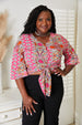 This printed blouse features a flattering V-neckline and three-quarter sleeves, creating a chic and sophisticated look. The tie hem detail adds a playful and feminine touch, making it a versatile piece that can be dressed up or down for any occasion.