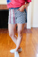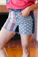 Show your patriotic spirit with these high-rise denim American flag designed shorts with a frayed hem, plenty of stretch and a one button zippered enclosure. Pair with sandals, or sneakers this summer season!