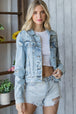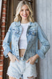 The distressed button-up denim jacket is a versatile wardrobe essential. Its edgy and worn-in style adds a bold statement to any outfit. With its comfortable fit and timeless design, it's perfect for layering over a casual tee or dressing up with a dress. The distressed details and button closure give it a unique and fashionable touch.
