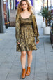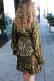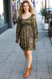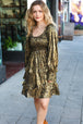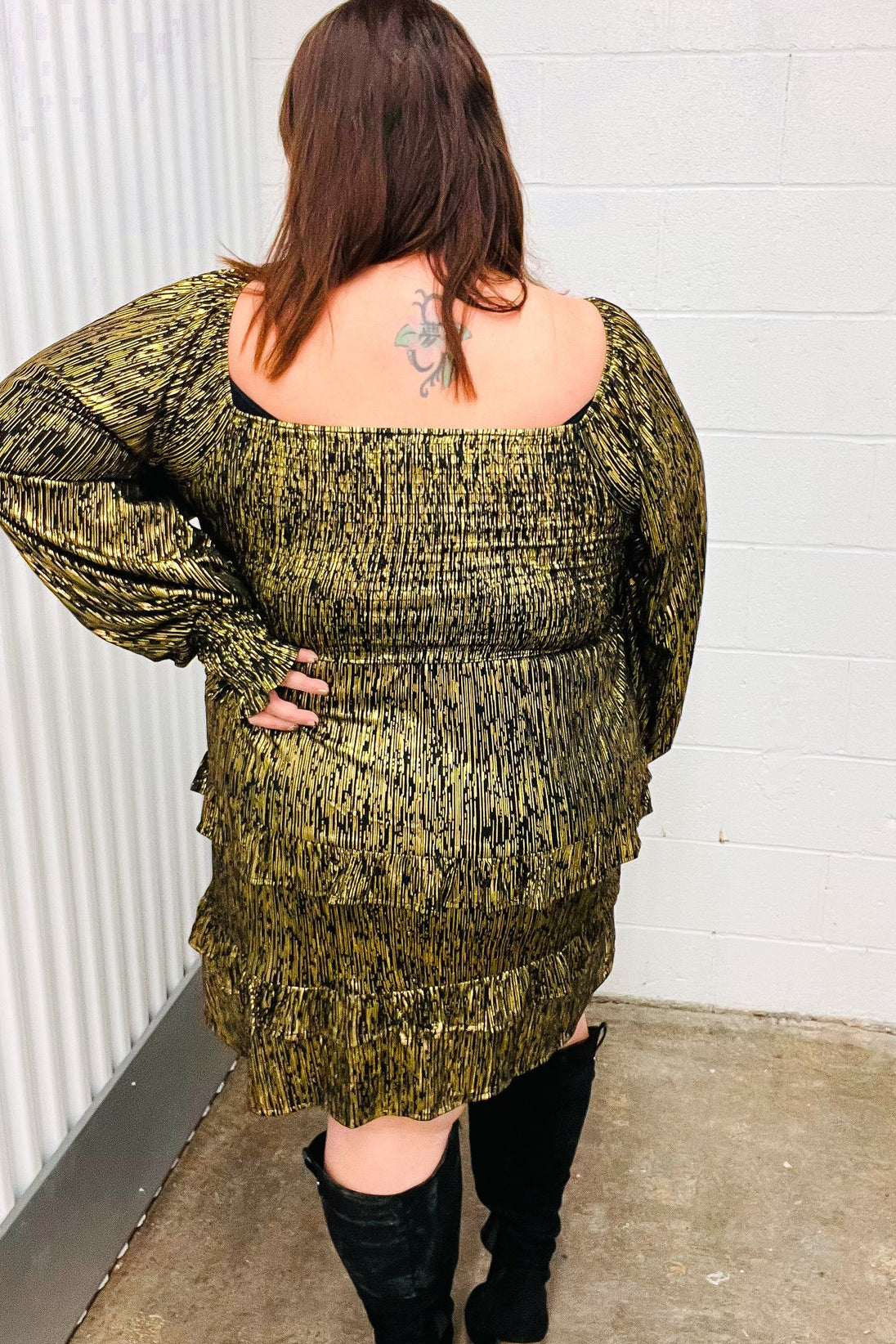 Get holiday party ready with this smocked chest gold foiled dress. Smocked cuff bubble sleeves and tiered ruffle design complete this stunner!