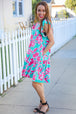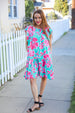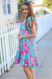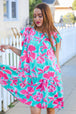 Look more than lovely in this aqua & fuchsia floral print knee-length woven dress with a beautiful drape, tiered design and side pockets. Get your summer on with short flutter sleeves!