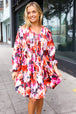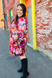 Add a pop of color and a touch of femininity to your fall wardrobe with this stunning floral print dress. With side pockets, a tie neck and pintuck details, this satin dress is sure to be a head turner.