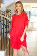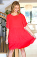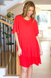 Get ready for warmer weather with this stunning solid red midi length dress that features a three-panel tiered design and stunning flutter sleeves. A keyhole back button clasp and a babydoll style complete this flattering dress.