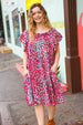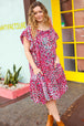 ok more than lovely in this fuchsia and teal abstract dot print midi-length woven poplin dress with a beautiful drape, tiered design, and side pockets. Get your summer on with short flutter sleeves!