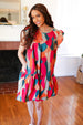 Look more than lovely in this multicolor geometric print midi-length woven dress with a beautiful drape, tiered design and side pockets. Get ready for warm weather with this unique dress!