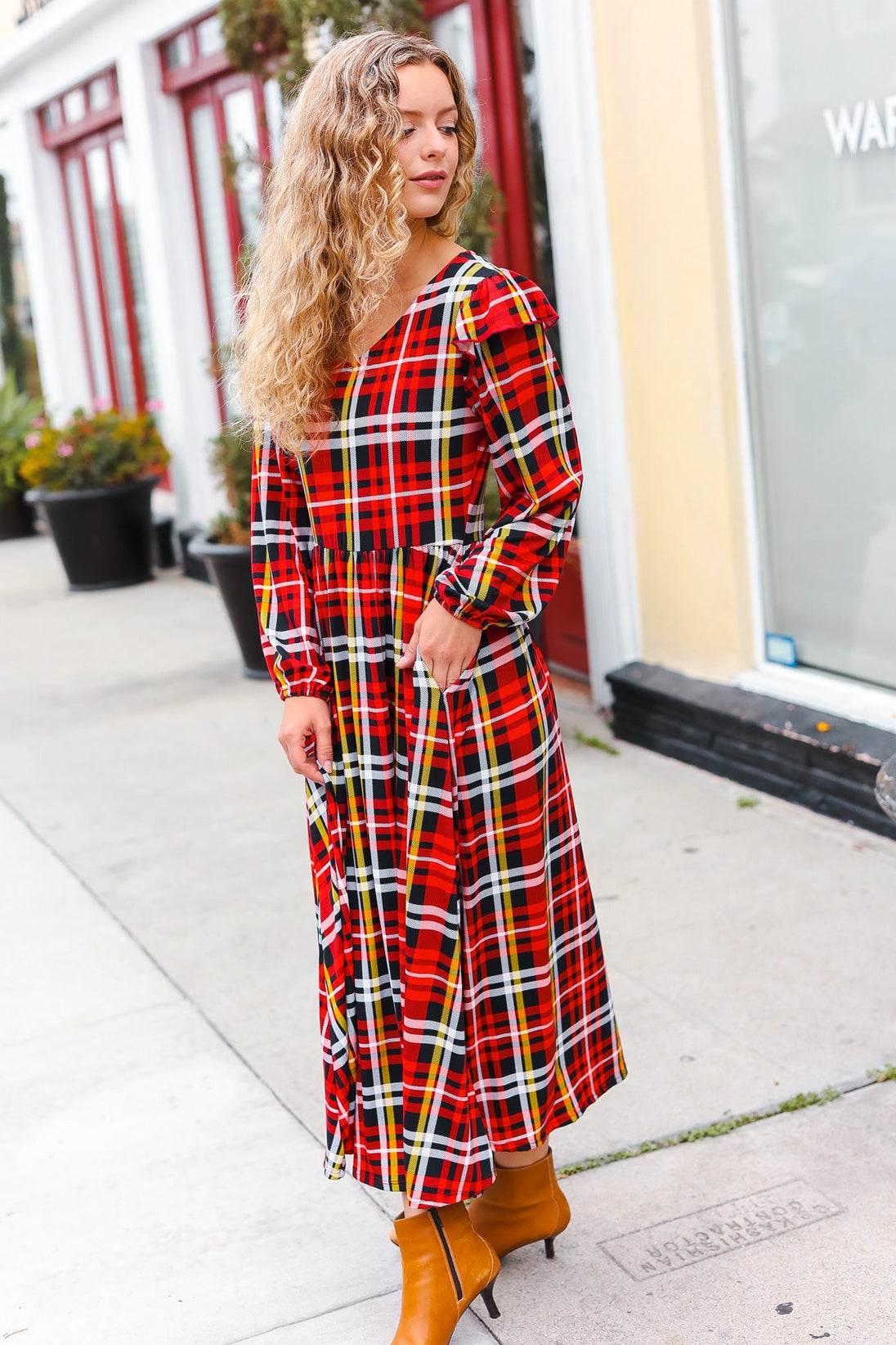Plaid + V Neck + Ruffle Detail + Fit & Flare