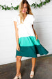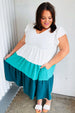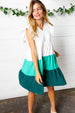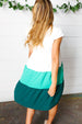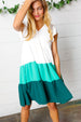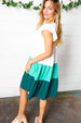Look more than lovely in this ivory seafoam green & emerald midi-length woven crinkle dress. With a beautiful drape, side pockets and short frill flutter sleeves, get your summer on with this stunning tiered paneled dress!