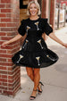 This is the perfect little back holiday dress with silky tiered black fabric combined with the most adorable sequin martini glasses. We love the smocked shoulder detail and the zip up back makes it so easy to take on and off.
