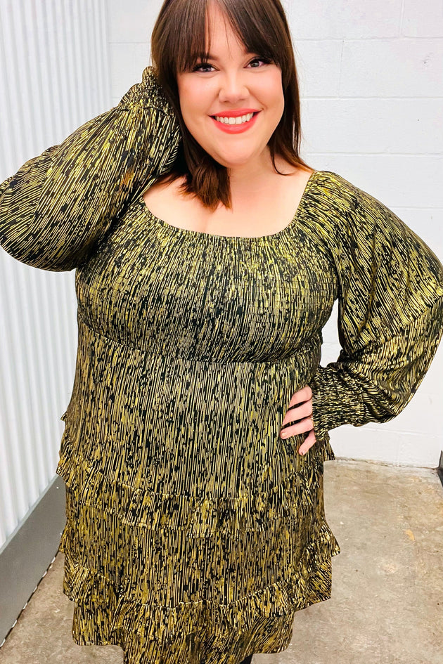 Sale                                 Dazzling Black Gold Foiled Smocked Fit & Flare Dress Sale price $18.99Regular price $24.95