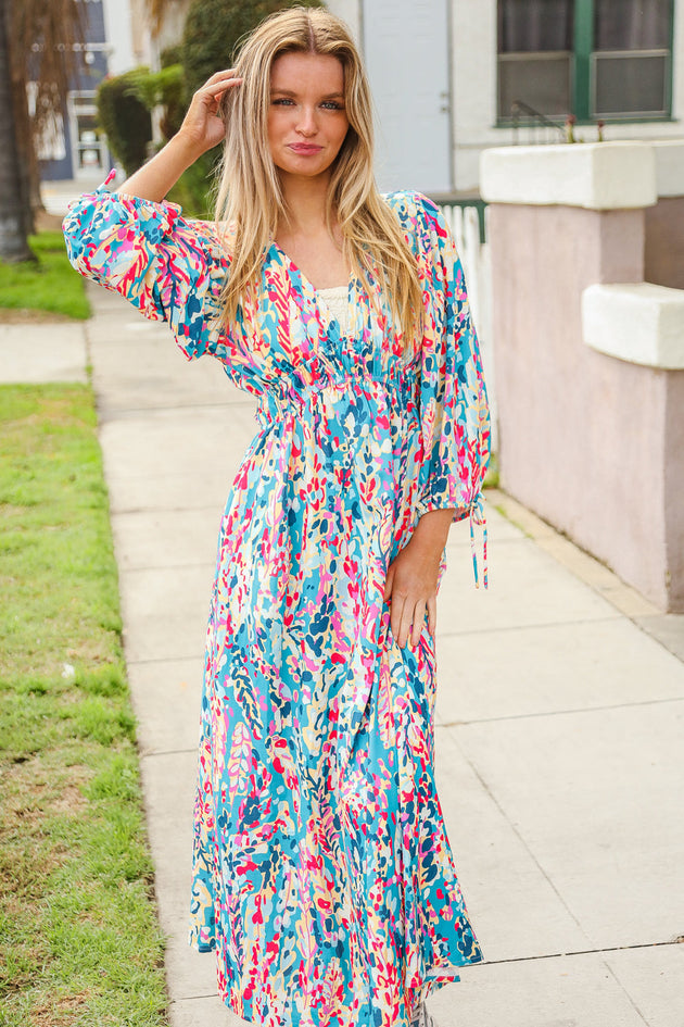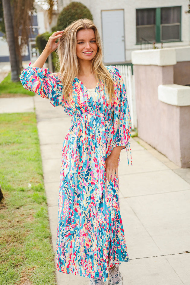 Find Love Blue Floral Raglan Puff Sleeves V Neck Smocked Waist Maxi Regular price $25.99