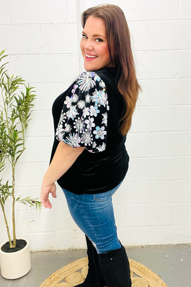 Feeling Glamorous Black Floral Sequin Puff Sleeve Velvet Top Regular price $26.99