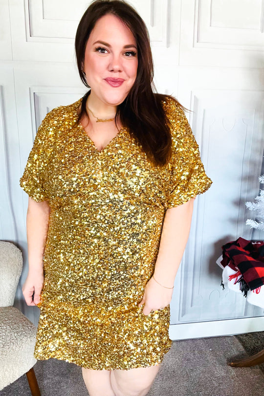 New Year Diva Dolman Gold Sequined Lined Babydoll Dress Regular price $21.99Look your best at holiday parties or New Year's with this gold sequined babydoll dress with short sleeves. With a dolman design, an elastic waist and fully lined, be ready to turn heads with this stunner!...