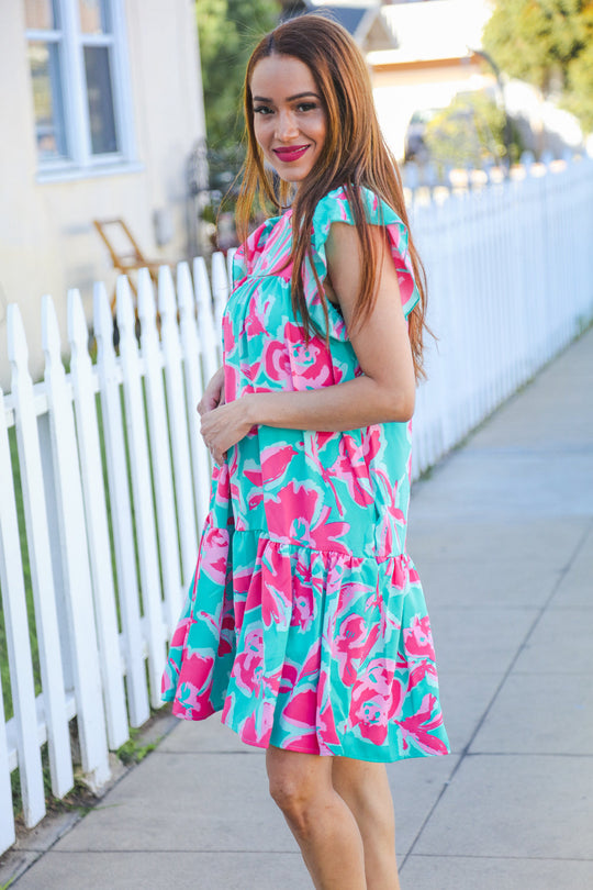 Sale price $20.99Regular price $21.95Look more than lovely in this aqua & fuchsia floral print knee-length woven dress with a beautiful drape, tiered design and side pockets. Get your summer on with short flutter sleeves! Side Pockets + Tiered + Ruffle... -