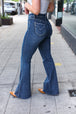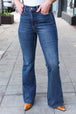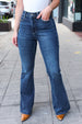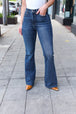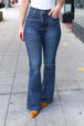 Get ready for fall with these high-rise flare jeans with functional front and back pockets with a unique design. The raw hem adds some flare to these dark wash jeans with plenty of stretch completes these flattering jeans.