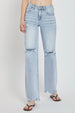 These high rise distressed wide leg jeans are a trendy and edgy addition to your denim collection. The high rise waist provides a flattering and slimming silhouette. The distressed detailing adds a cool and casual vibe to the jeans. The wide leg cut is chic and on-trend, perfect for creating a statement look. Pair them with a cropped top or tucked-in blouse for a fashion-forward outfit. These jeans are versatile and can be dressed up or down for any occasion.