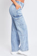 We're spending every day in our Junior High Rise Straight Leg Cargo Jeans. Constructed with comfy stretch denim and an elastic waistband, this trendy high-waisted jean will be your new favorite too. Detailed with front seams to draw the eye and elongate your legs, rectangular patch pockets, and flap cargo pockets at the side. We omitted back pockets and added a vertical seam for a look that compliments your bum. Style with a crop top and tennis shoes for a street-smart sporty vibe that's sure to rake in compliments!