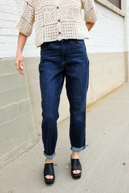 Judy Blue High-Rise Boyfriend Dark Blue Wash Jeans Regular price $50.99These high-rise boyfriend dark wash denim jeans have a trendy cuffed hem and functional front & back pockets. With plenty of stretch and a zipper fly, pair with your favorite booties or sneakers. 93% COTTON...