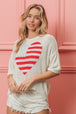 The striped heart contrast knit top is a sweet and charming addition to your wardrobe. Featuring a playful heart design on a striped background, this top offers a fun and whimsical look. The contrast detailing adds a unique touch, making it stand out from your typical striped tops. With a cozy knit fabric, this top is perfect for cooler days while keeping you stylish. Pair it with jeans or shorts for a casual and cute outfit. Show off your playful side with this adorable and trendy striped heart contrast knit top.