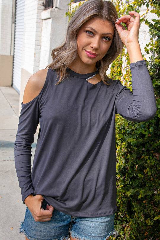 Sale                   Cement Cold Shoulder Cut Out Long Knit Top Sale price $8.99Regular price $13.95Add some sophistication to your casual ensemble with this cement-colored brushed knit cold should cut out top with long elegant sleeves. Brushed Knit + Cut Out Shoulder 95% POLYESTER 5% SPANDEX Designed in California Runs True...