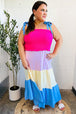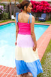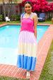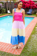 Step into summer with charming elegance with this color block tiered fit and flare maxi dress with a smocked bodice and shoulder tie straps. Layer with a denim jacket or wear solo for a sublime look!