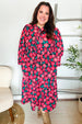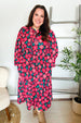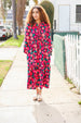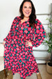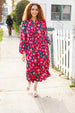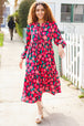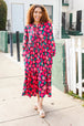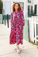 Look more than adorable in this vibrant coral and fuchsia floral tiered maxi dress featuring trendy ribbon bow ties, side pockets and flattering long elastic bubble sleeves.