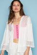 The designed open front oversized fit cardigan with 3/4 length bell sleeves is a chic layering piece for any outfit. Crafted from a mix of jersey and lace, this cardigan combines comfort with a touch of elegance. The frayed edge detail on the entire garment adds a contemporary and edgy vibe, giving it a unique and textured look. Perfect for adding a fashionable flair to your ensemble, this cardigan can be dressed up or down for a variety of occasions. Embrace both comfort and style with this versatile and trendy piece that is sure to elevate your wardrobe with its modern design and feminine silhouette.
