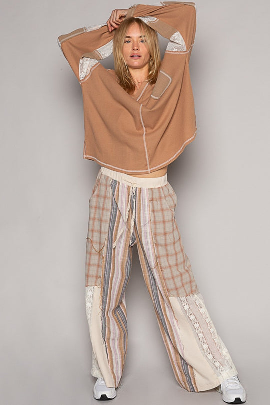 POL Plaid Patchwork Long Sleeve Shirt with Raw Edge Detail