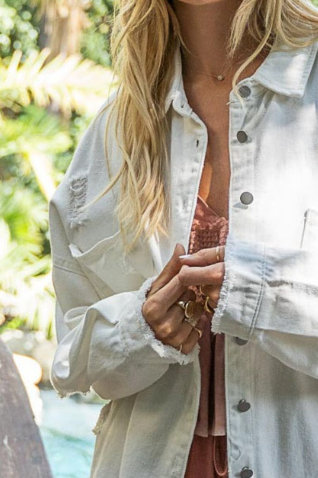Sold out          POL Button Down Raw Hem Distressed Shacket Regular price $54.99