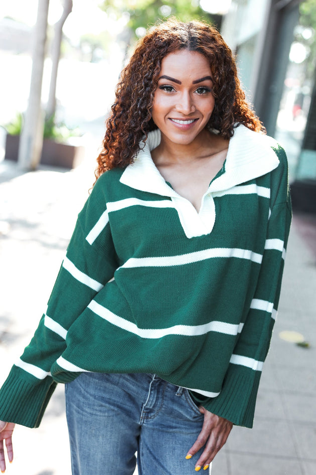 Fall For You Hunter Green Stripe Notched Neck Collared Oversized Sweater Regular price $17.99