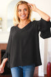 With a V neck and hi-lo waterfall three quarter ruffle sleeves, this floral print woven top is a great summer to fall transitional piece. Perfect for the office or play!
