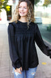 Refresh your holiday closet while adding a touch of femininity with this shirred yoke top with long elastic ruffle sleeves. A stunning frill mock neck and keyhole button back completes this versatile and stunning top.