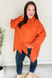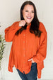 Embolden your closet with this tunic style button down cotton slub shark bite top featuring a flowy, ruffle hem design and cut edge details.