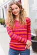 Add a pop of color to your winter wardrobe with this striped cable knit print v neck top. Made with long sleeves, and cozy hacci knit to keep you warm this season.