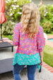 Bring on sun, sandals and all-things-feminine with this woven peplum short dolman sleeve top. Designed with paisley floral print and a border print shark bite hemline, step into summer with style and confidence!