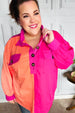 Look casual and cool in this quarter collared button-down pullover made with soft French terry. With raw edges, a orange and fuchsia color block design and button flap chest pockets, elevate your casual closet with this stunner!