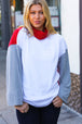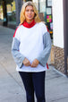 Catch glances at your holiday parties with this Hacci turtleneck made with a color block palette of white, grey and red. Stunning two-tone jacquard wide sleeves complete a festive and stylish look.