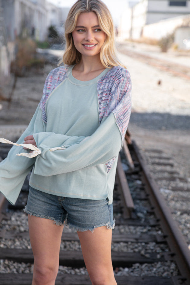 Mint Lace Up Long Sleeve French Terry Oversized Pullover