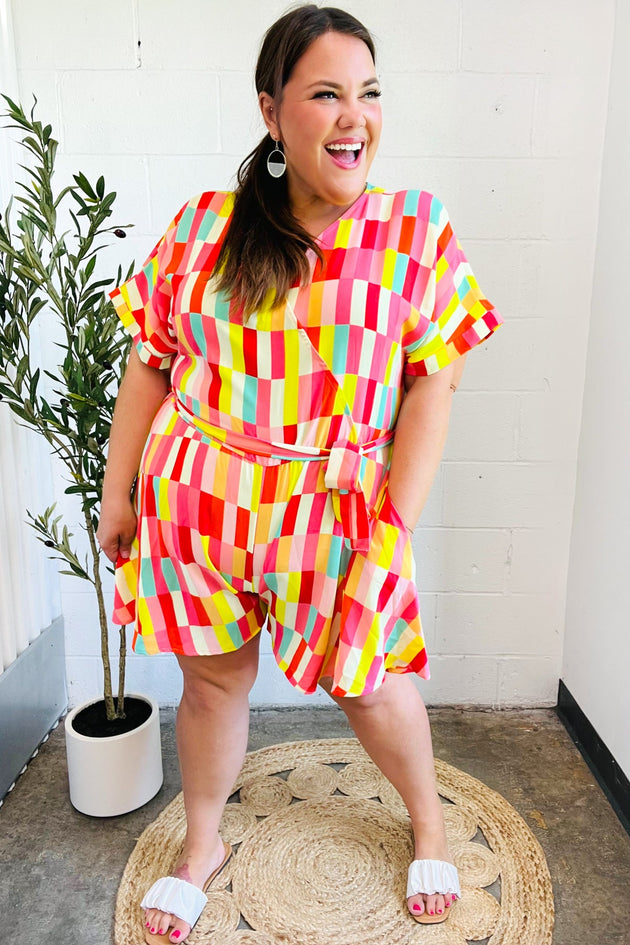 Eyes On You Coral Geo Abstract Surplice Woven Romper