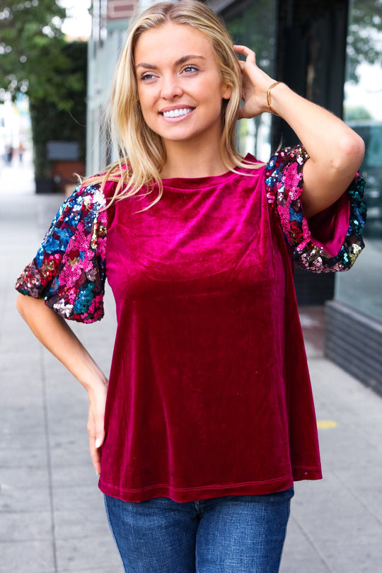 Diva Dreams Wine Floral Sequin Puff Sleeve Velvet Top