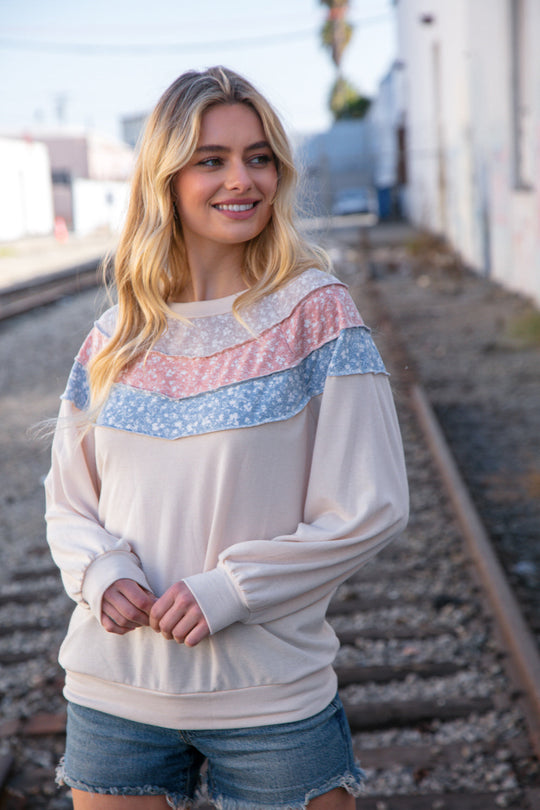 Sale price $11.99Regular price $15.95Sport new spring colors with this gorgeous light-weight pullover made with a color block palette of taupe, sky blue and dark peach. Made with outseam overlock reverse stitching, this long sleeve pullover is stylish and versatile.... -