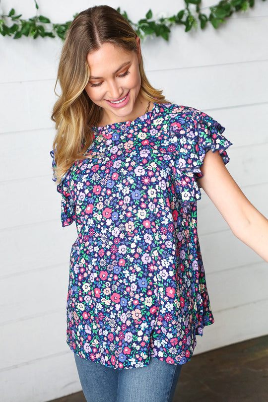 Navy Floral Mock Neck Flutter Sleeve Top