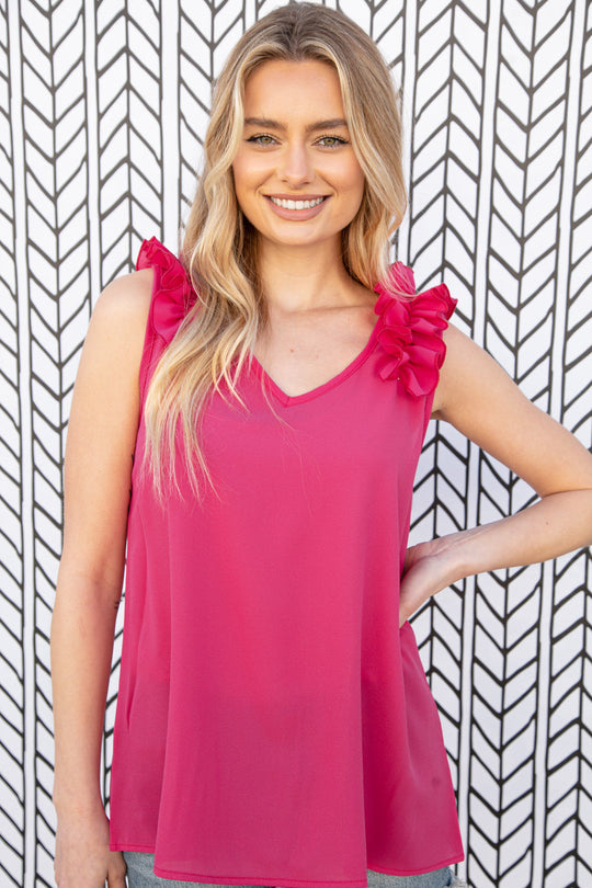 Fuchsia Frill Shoulder Sleeveless Crepe Woven Top