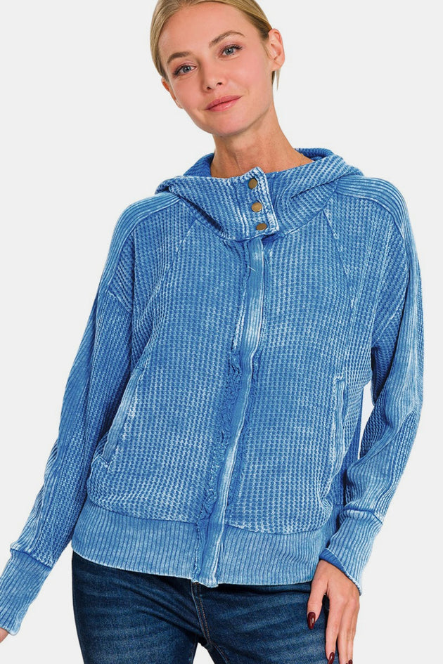 Culture Code Full Size Ribbed Zip Up Drawstring Hooded Jacket