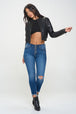 This zip-up cropped bomber jacket is made with vegan leather for a stylish and cruelty-free option. The bomber style gives it a trendy and edgy look. It features a hidden pocket for practical storage. Perfect for adding a touch of attitude to any outfit. Ideal for those looking for a chic and sustainable fashion choice. This jacket is a versatile and fashion-forward addition to your wardrobe.