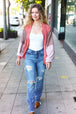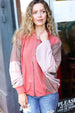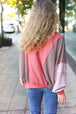 If you're looking for a trendy jacket, look no further than this zip up camel and sienna color block knit bomber jacket sporting banded bubble sleeves and cut-edge reverse stitch details.
